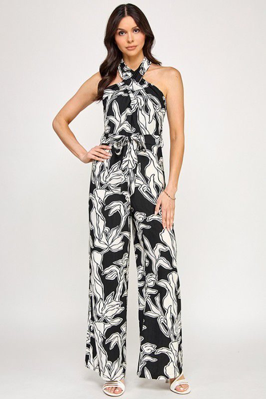 Mono con cuello halter y estampado de bloques de color negro con blanco