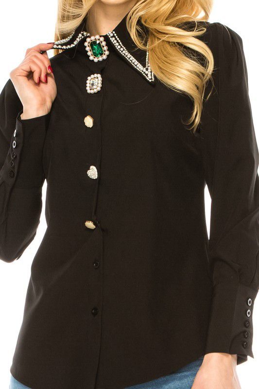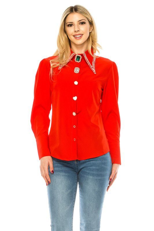 Blusa de manga larga con botones para mujer. NEGRO Y ROJO