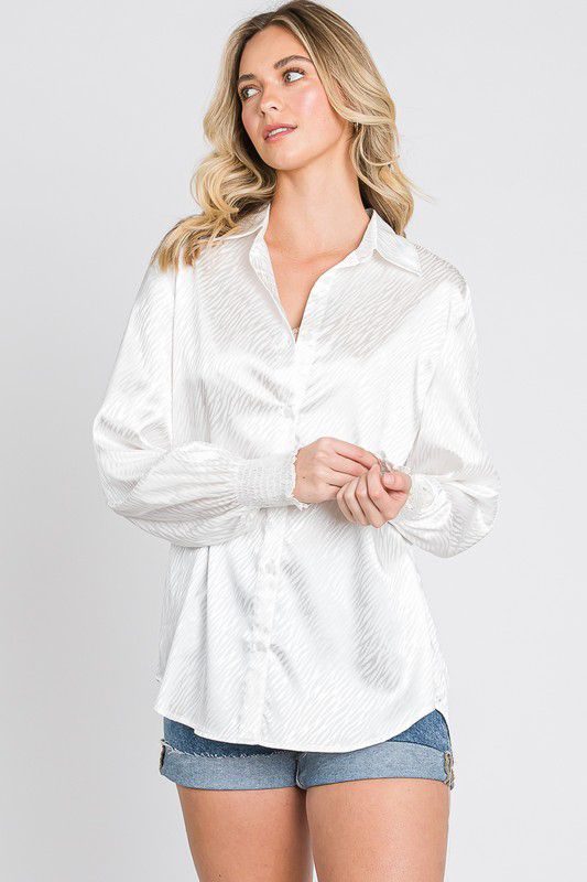 Camisa ahumada con mangas abotonadas y estampado animal de satén.BLANCORD$1,579.00Seleccionar opciones Este producto tiene múltiples variantes. Las opciones se pueden elegir en la página de producto