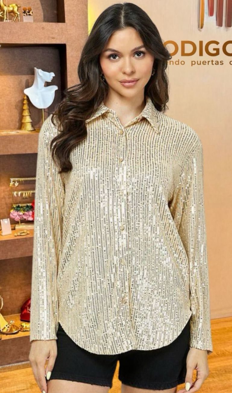 La blusa de lentejuelas en color crema (o beige) con botones y manga larga es una pieza clave para looks de fiesta o eventos nocturnos, aportando un brillo elegante y una estructura formal