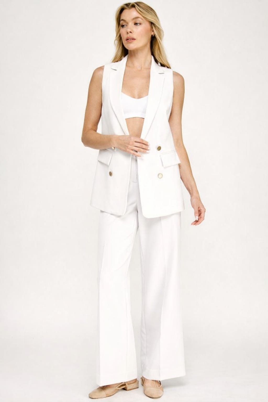 conjunto de chaleco con solapa de muesca lisa pantalon de pierna ancha lisos blanco
