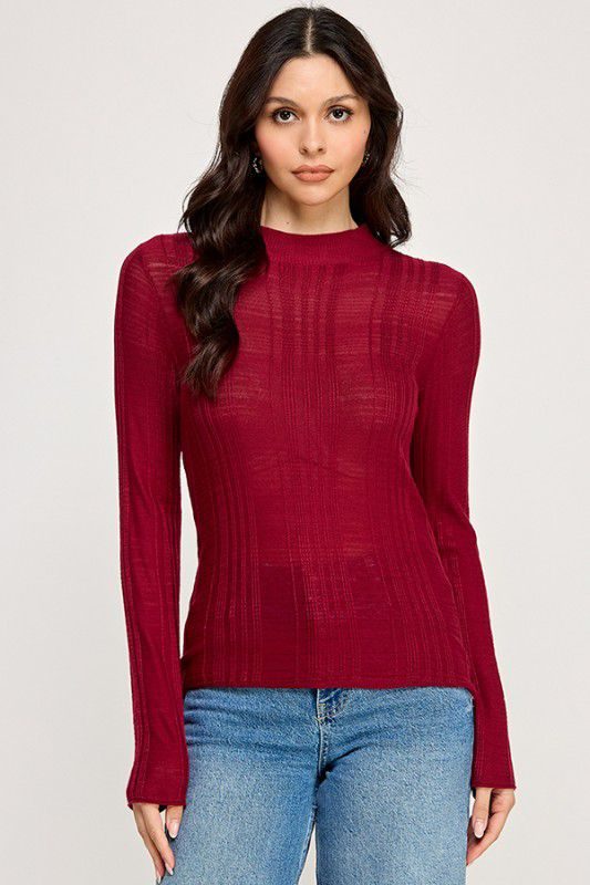 Suéter de manga larga en color borgoña, confeccionado con un diseño moderno de efecto simulado a cuadros transparentes que combina textura y estilo.
