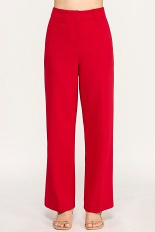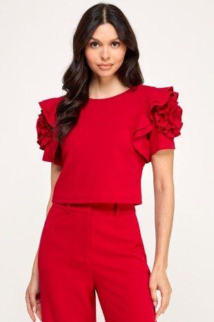Top liso en color rojo con un elegante cuello redondo y mangas a capas adornadas con flores 3D estampadas, que aportan textura y un toque femenino.