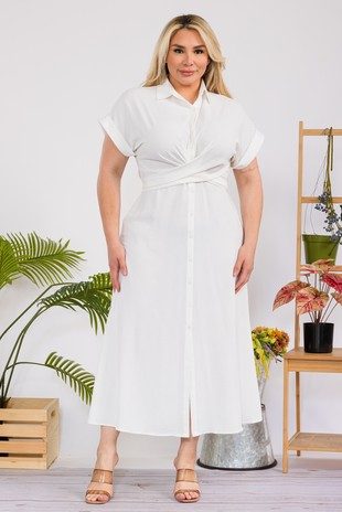 Vestido largo contemporáneo de talla grande en color blanco liso, diseñado para realzar la figura con comodidad y estilo.